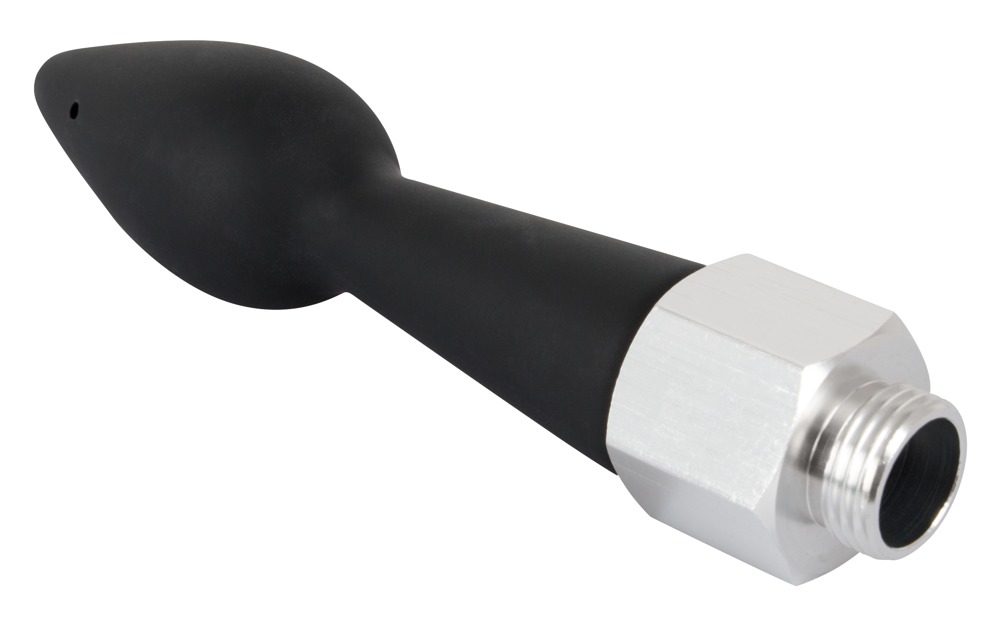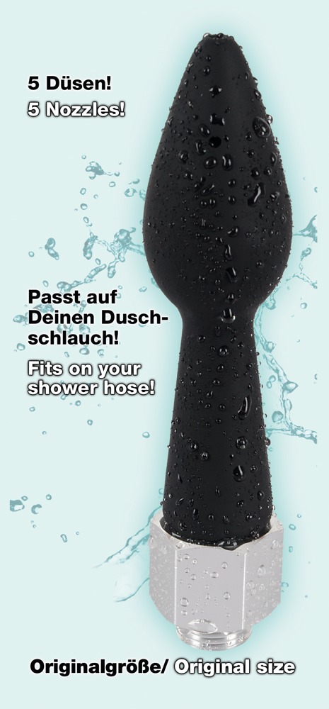 Blitzeblank im Hinterstübchen! Gerade vor analen Spielereien mit dem Partner möchte man es doch schön sauber haben im Popo und so bietet es sich doch an, das Nützliche gleich mit dem Vorspiel zu verbinden... Schrauben Sie einfach das Schraubgewinde der Intimdusche auf Ihren Duschschlauch und schon kann es losgehen: Langsam gleitet die samtig-weiche Oberfläche des konischen Plugs aus schwarzem Silikon an seinen Bestimmungsort, um Sie dort intim zu reinigen. Aus fünf Löchern, davon eines in der Spitze des Plugs, spritzt das Wasser für erregende Vergnügen unter Wasser!