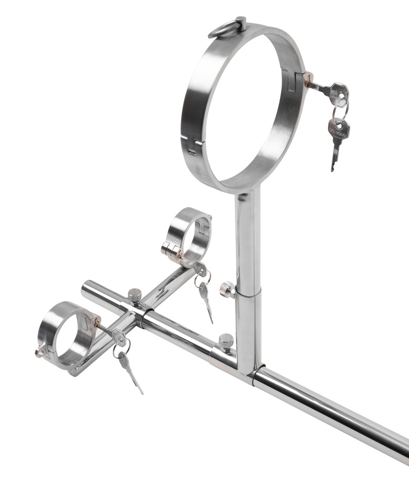 Die Handgelenke, Fußgelenke und der Hals werden mit Schellen an dem Bodengestell fixiert.