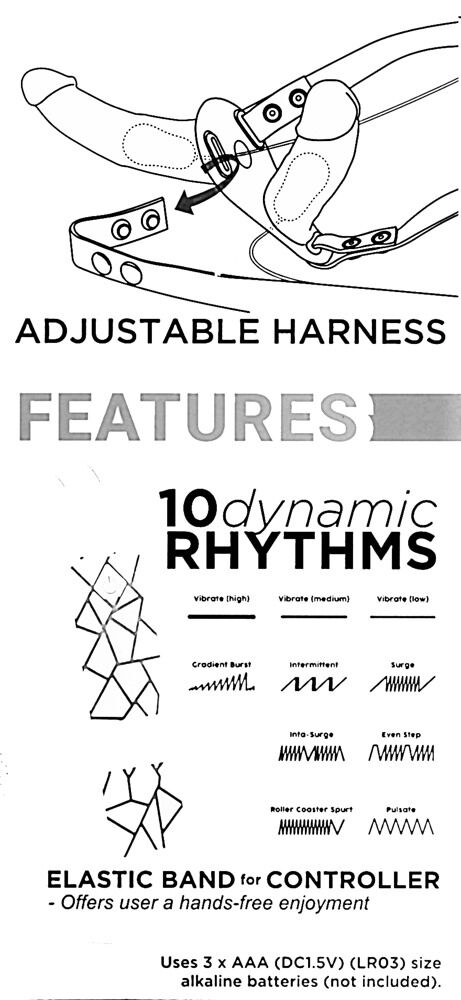 Beide Vibratoren mit ausgeprägter Eichel und angedeuteter Äderung sowie 10 Vibrationsmodi, steuerbar über die kabelgebundene Fernbedienung, die in eine kleine Schlaufe am Hüftgurt eingesteckt werden, sodass die Hände frei bleiben.