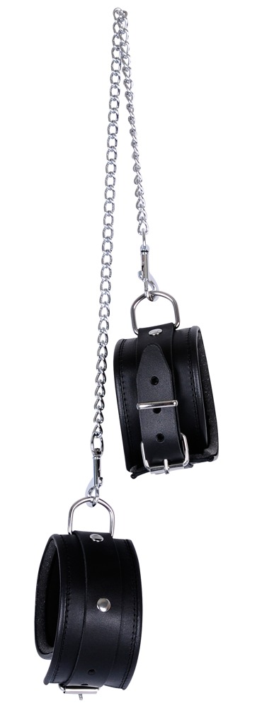 Ca. 6 cm breite, verstellbare Fußgelenk-Manschetten aus schwarzem Leder, innen weich gepolstert.