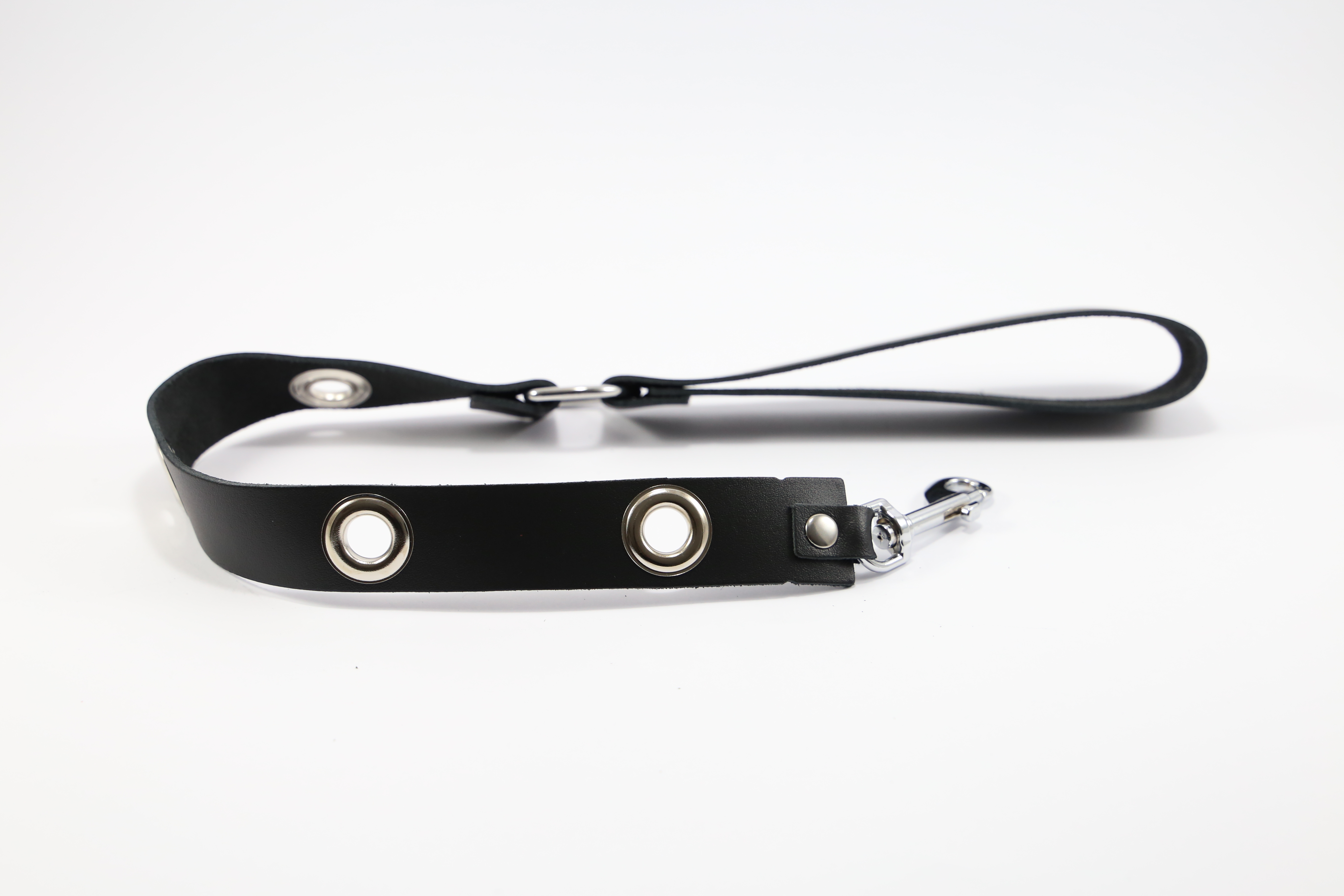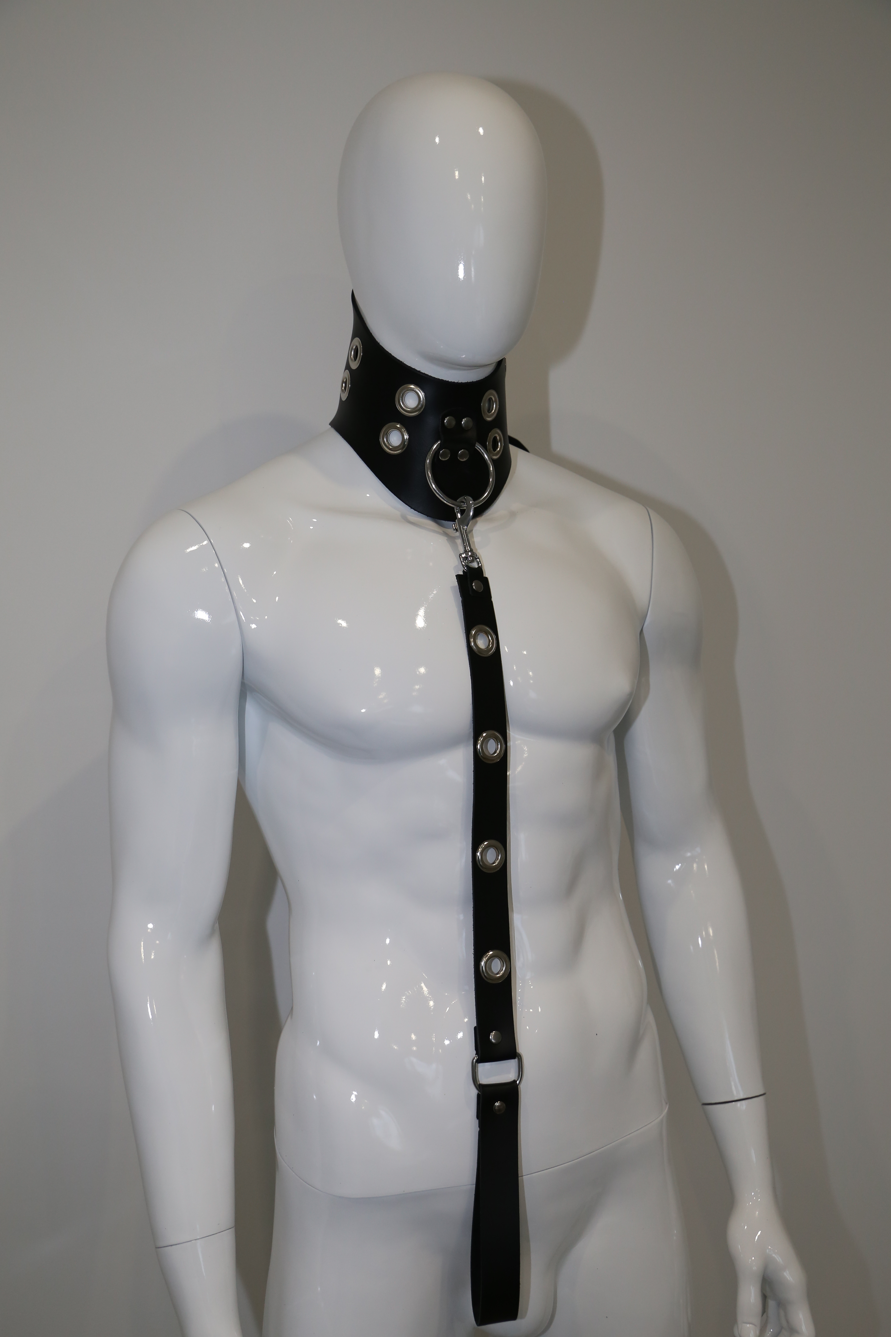 Halsfessel und Leine aus robustem Leder und verstellbar.
