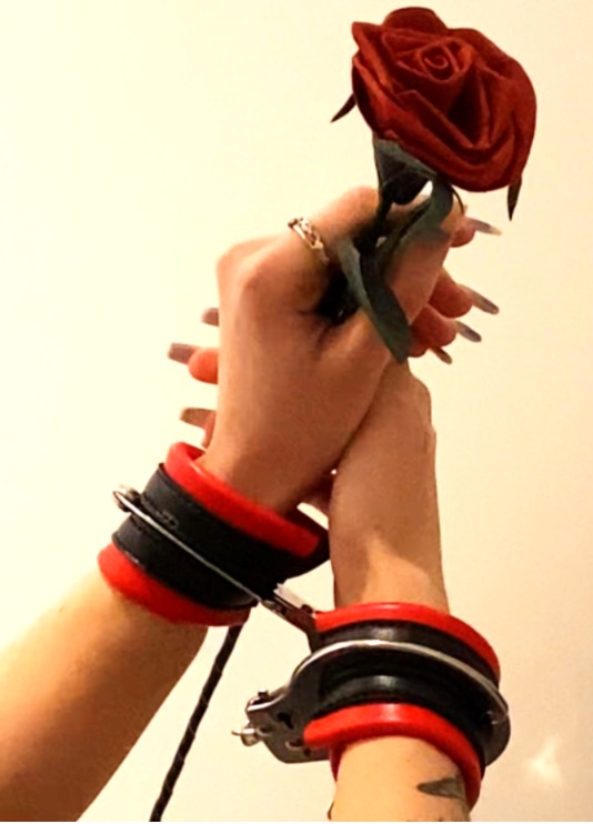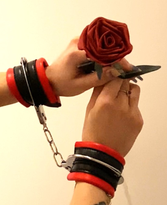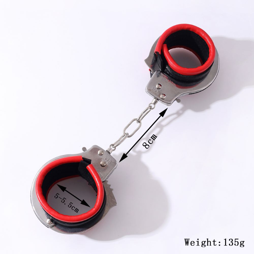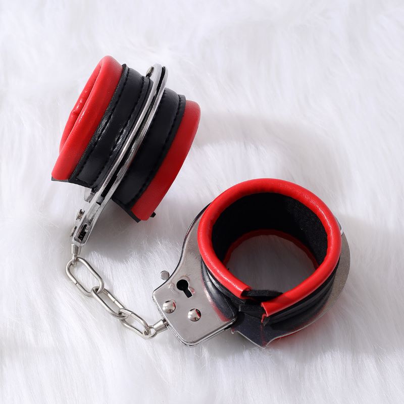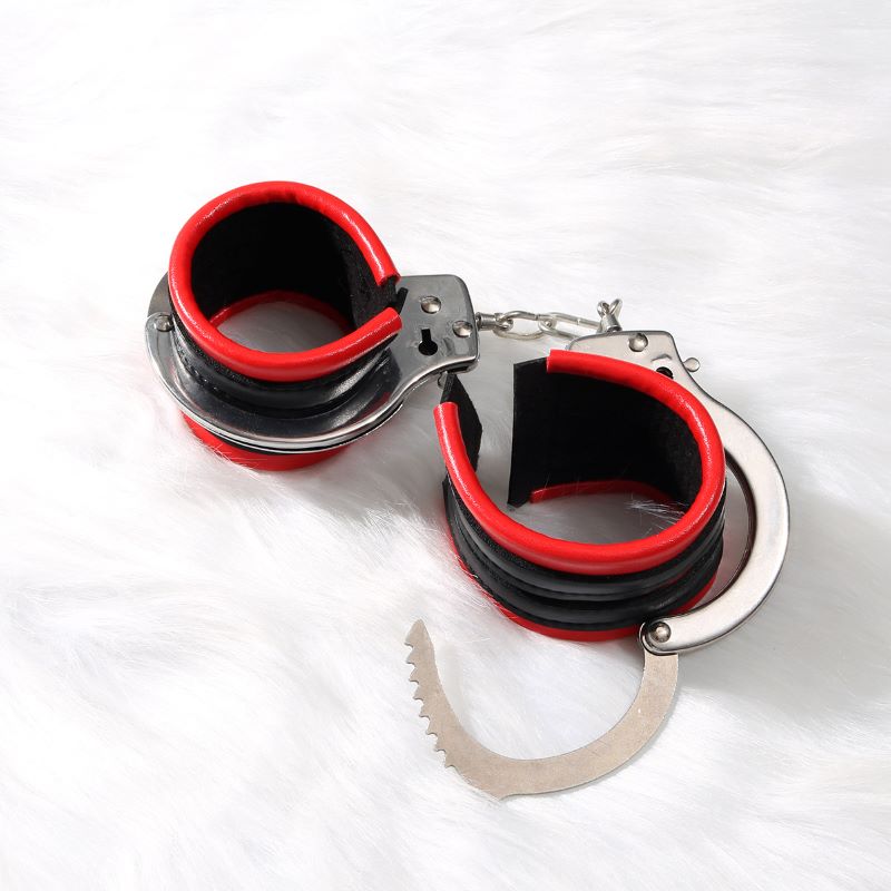Handschellen aus Metall mit rot-schwarzem Gelenkpolster.