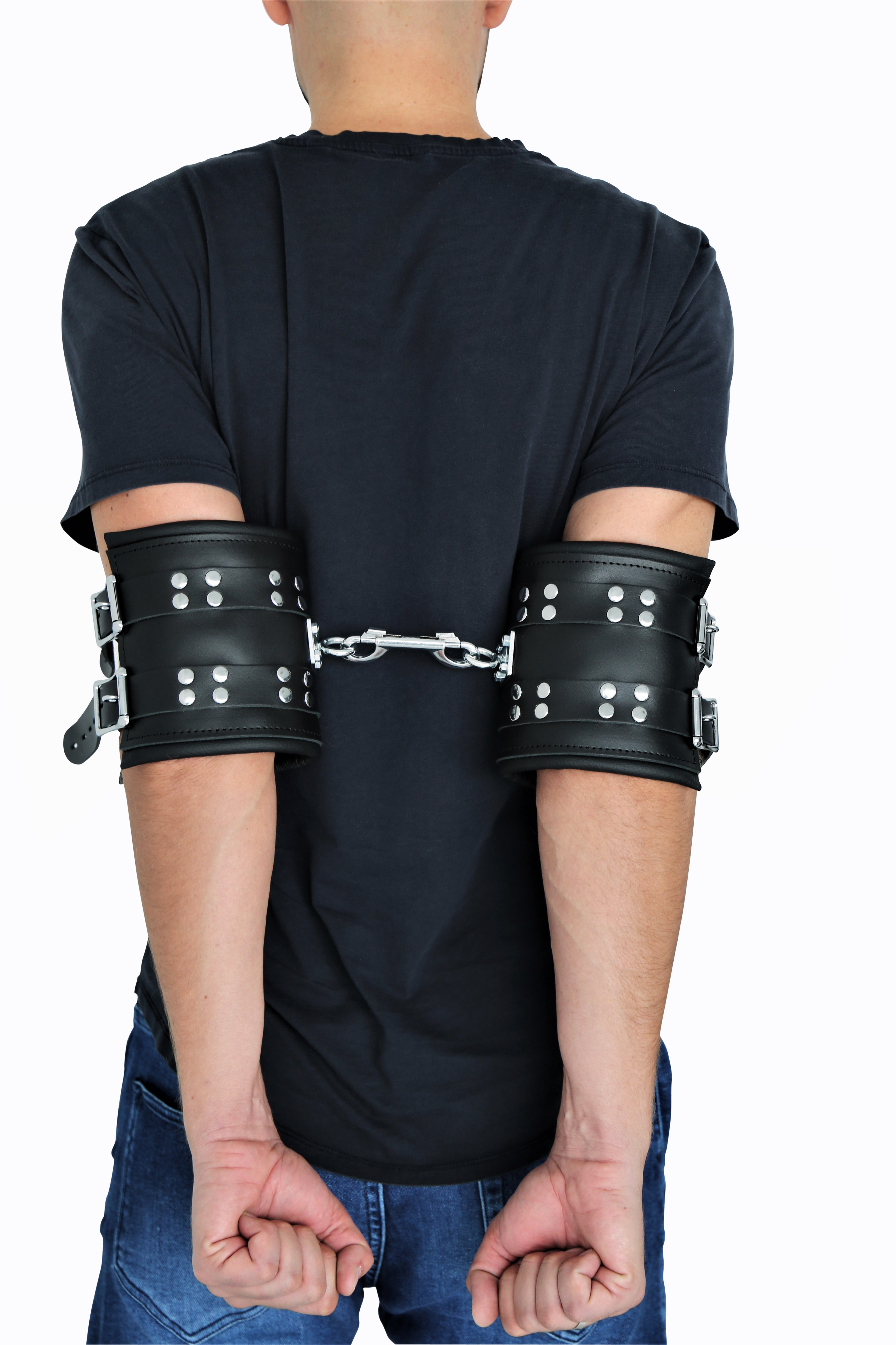 Ellbogenfesseln aus schwarzem Leder und weich gepolstert (inkl. 1 Doppelkarabiner/abschließbar).