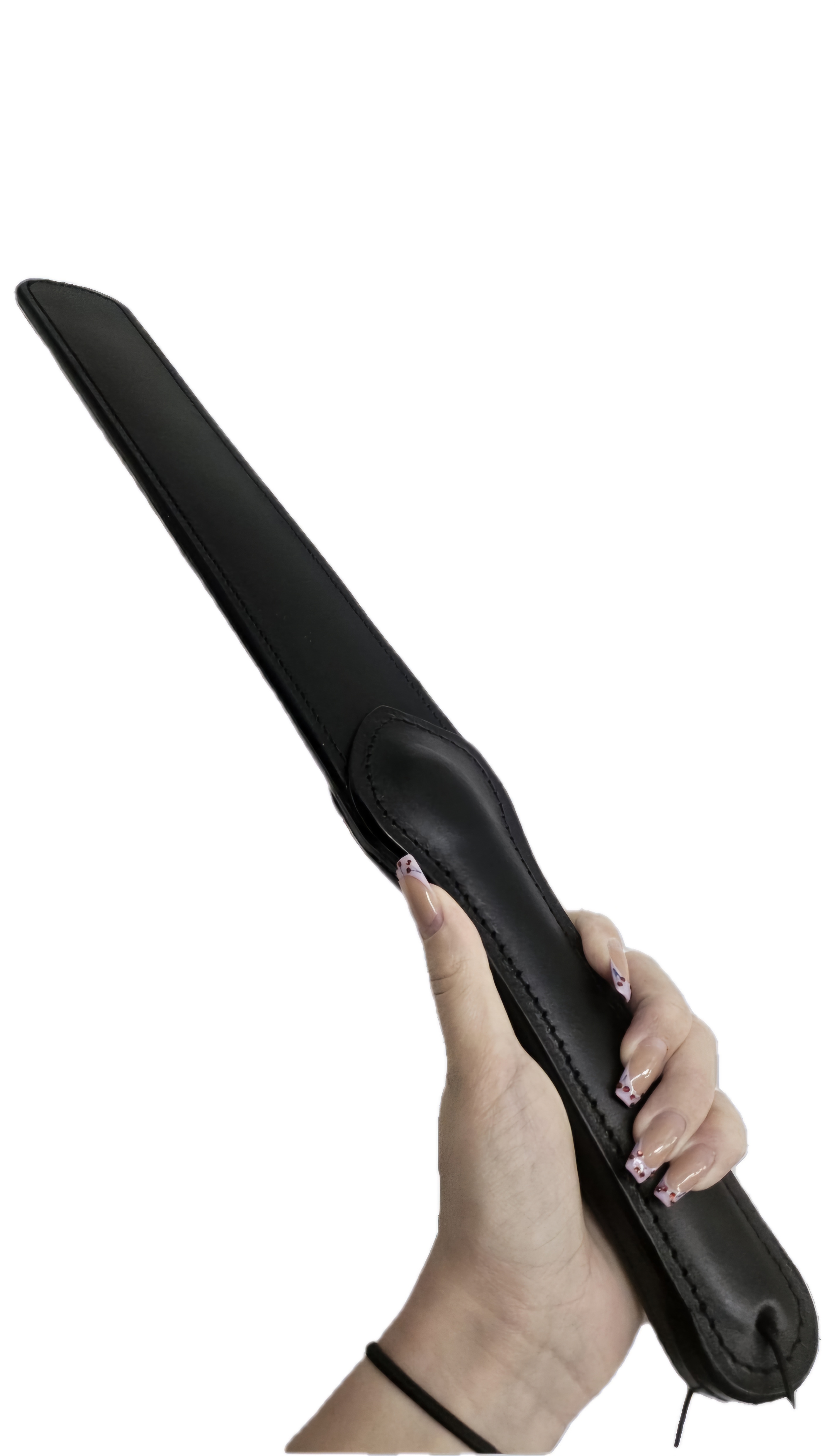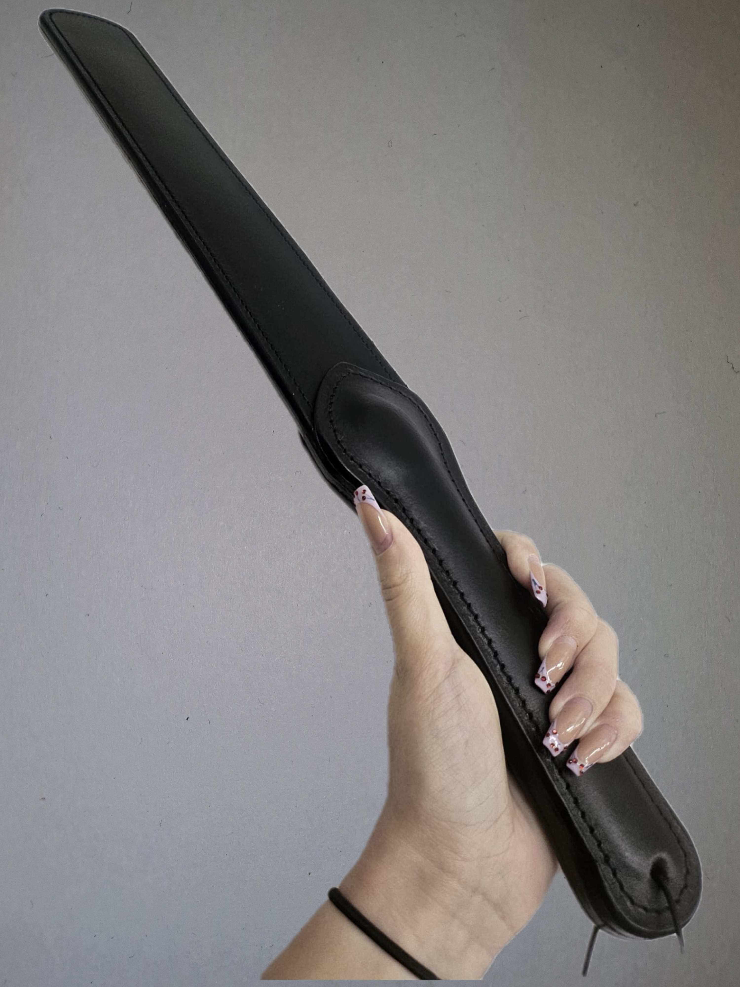 Sehr schönes Paddle aus schwarzem Leder gefertigt, hat durch die zwei übereinander genähten Lederflächen einen sehr effektiven Schlageffekt.