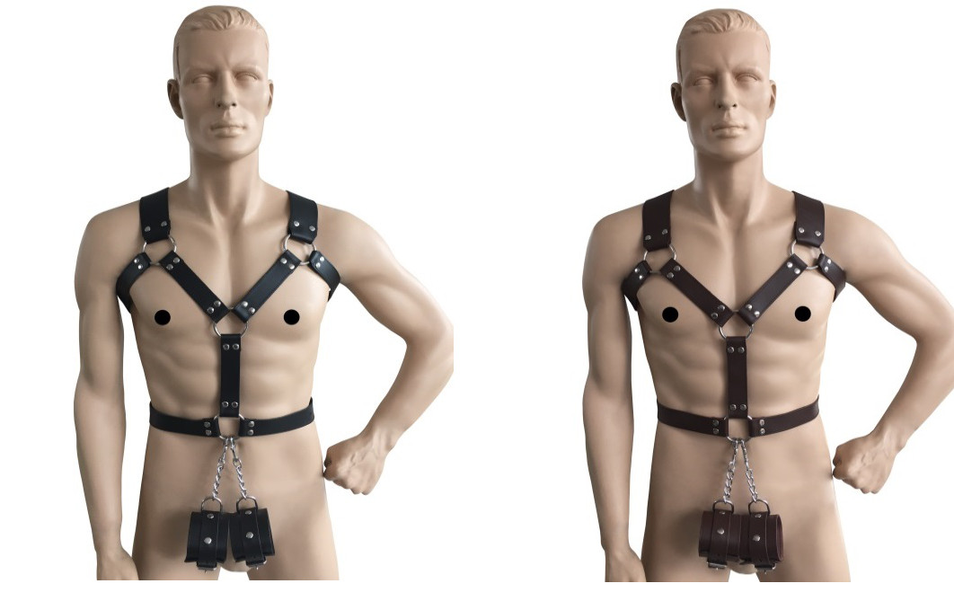Harness und Handfesseln aus robustem Leder mit Karabinerhaken.