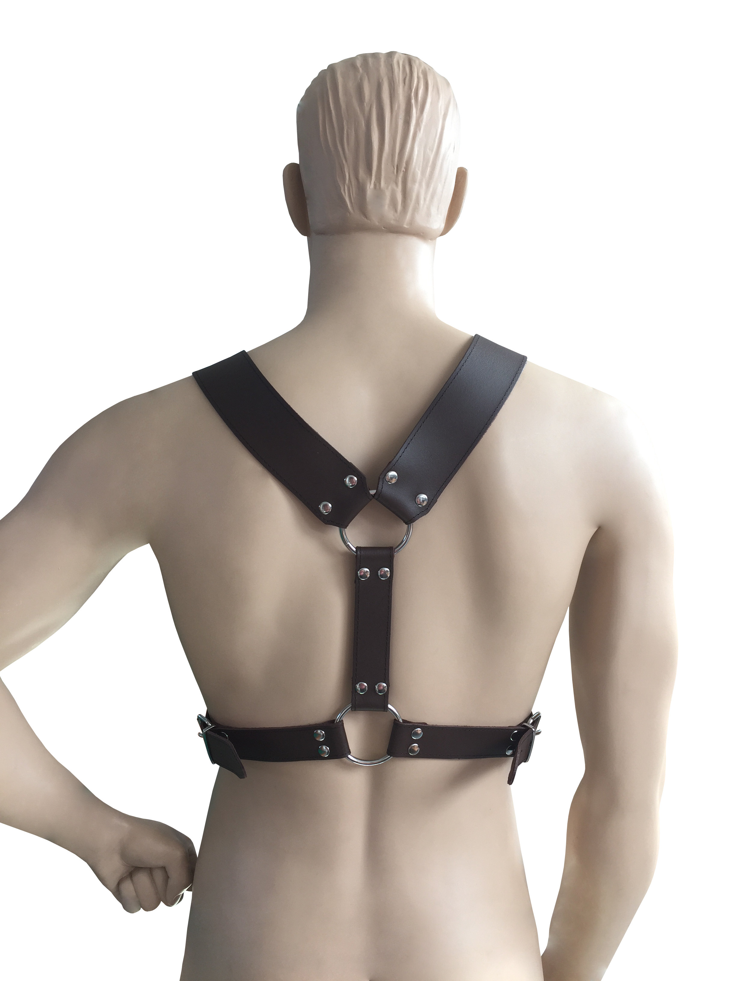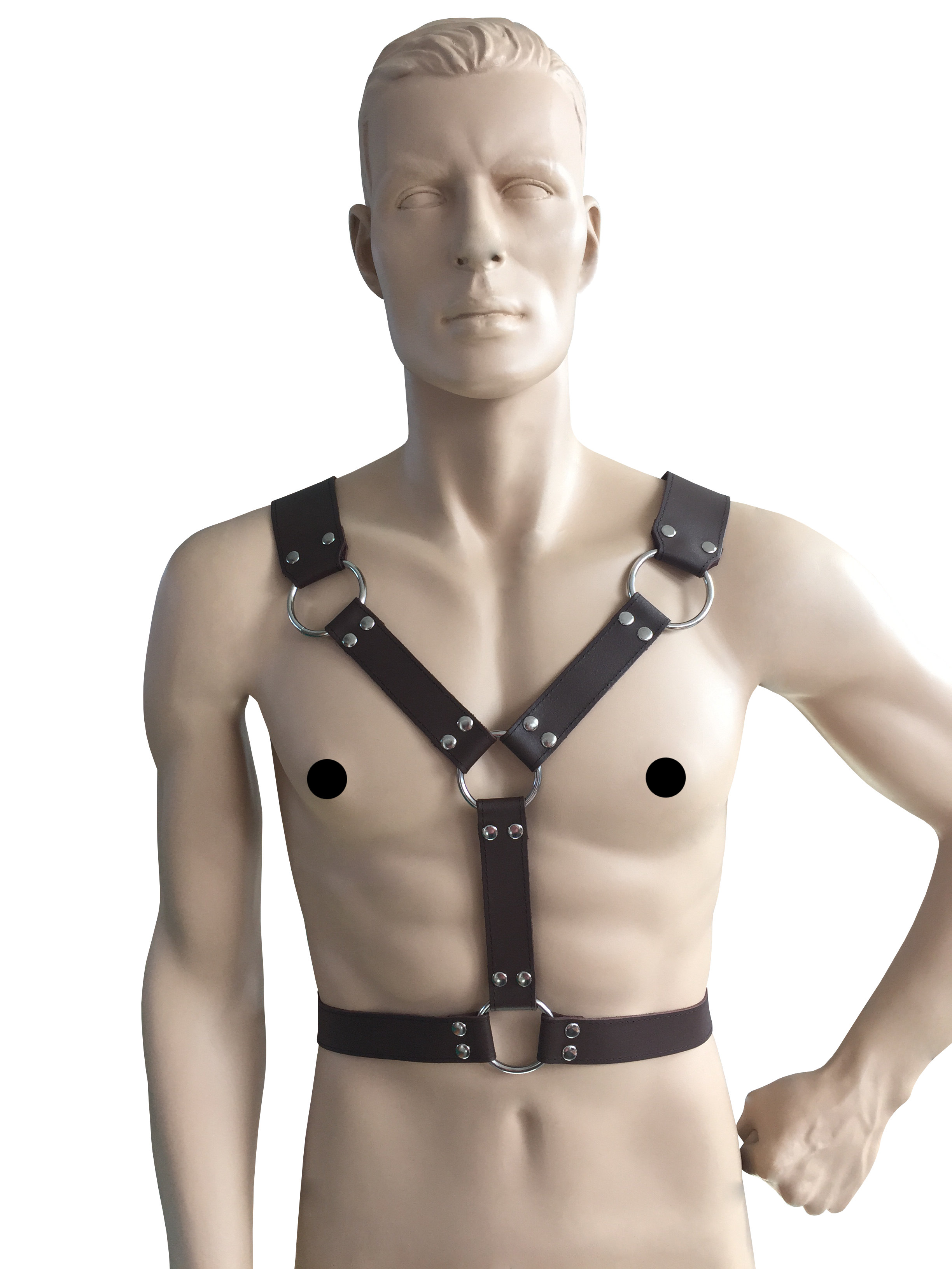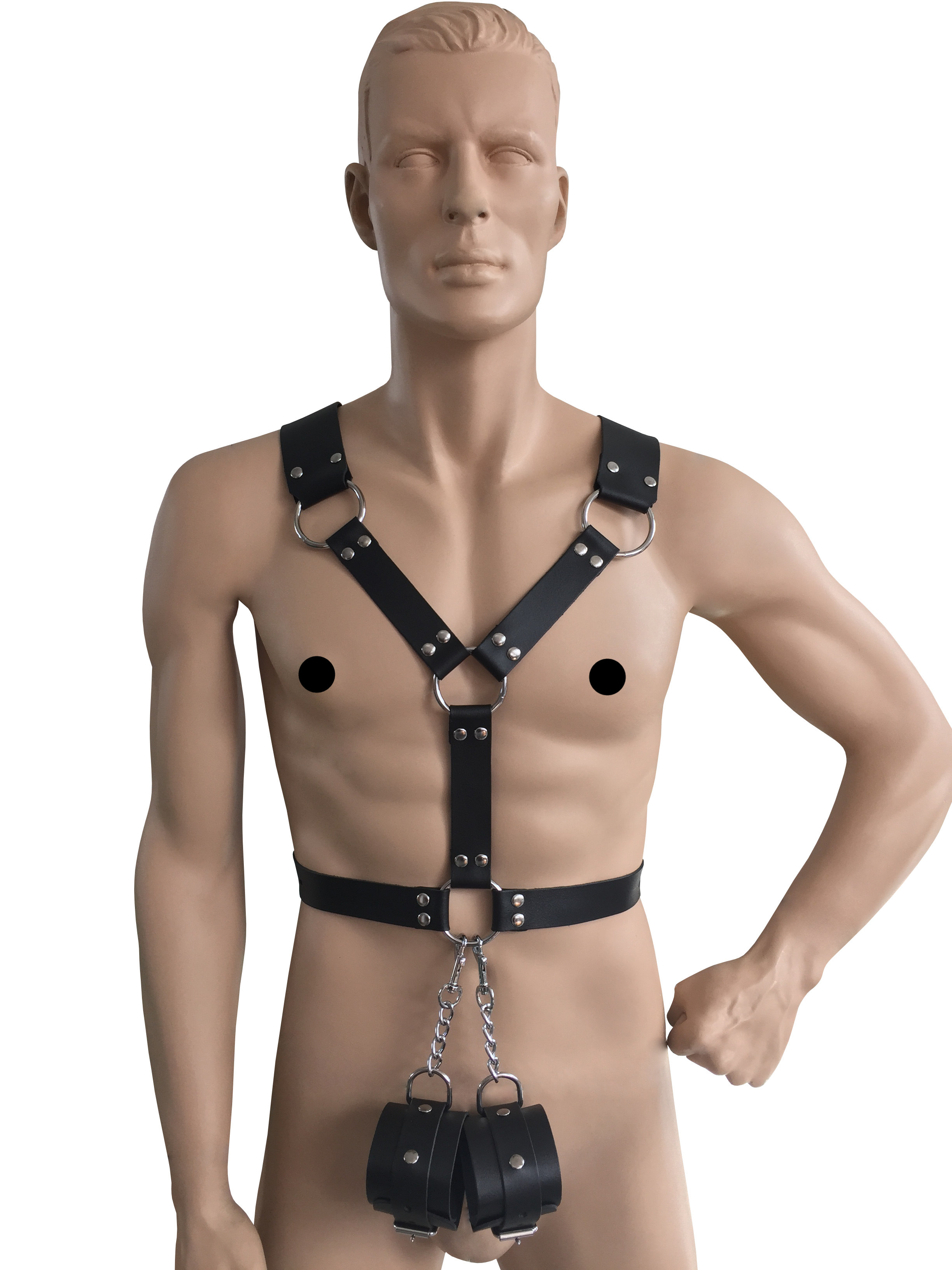 Harness und Handfesseln aus robustem Leder mit Karabinerhaken.