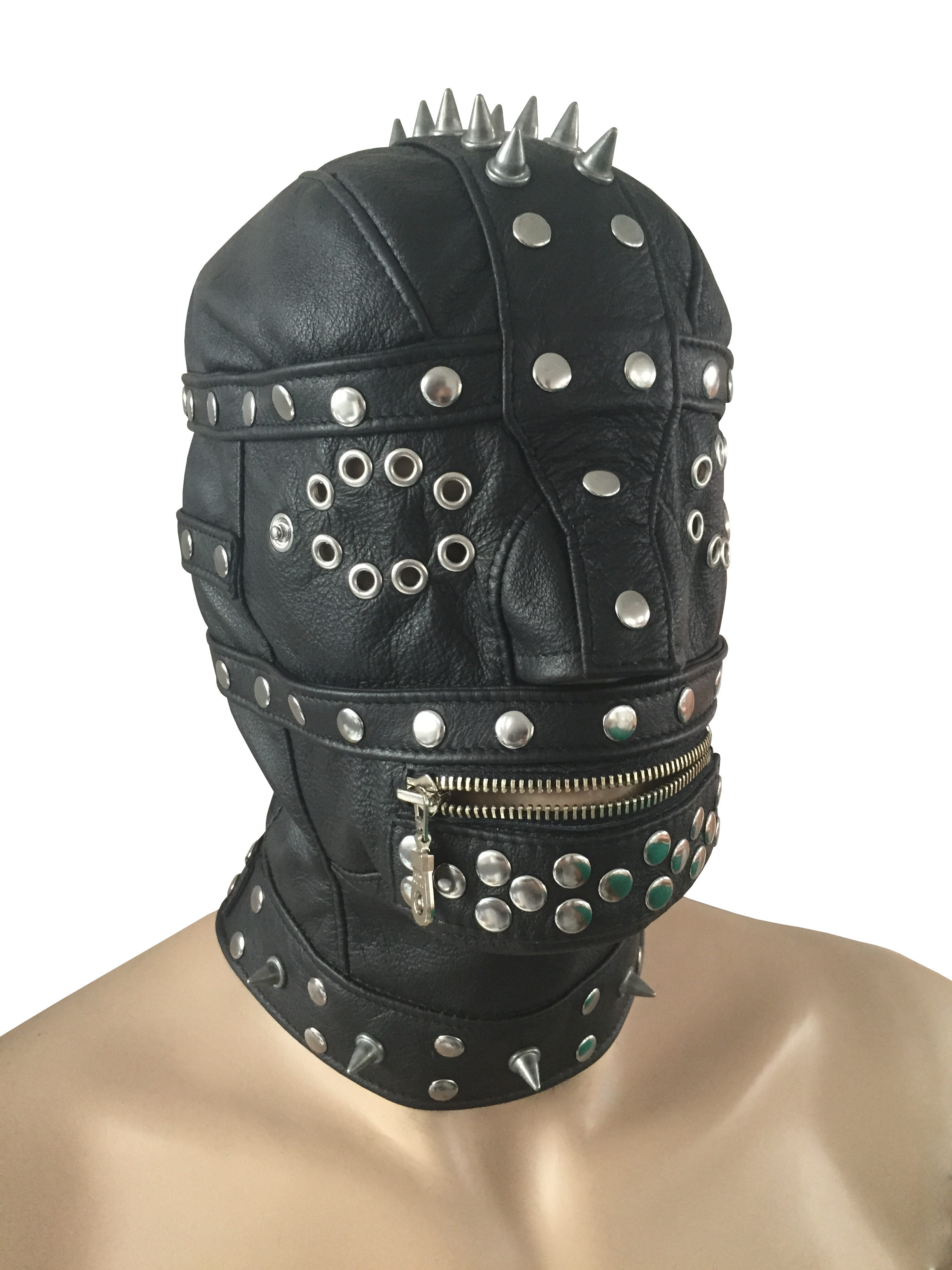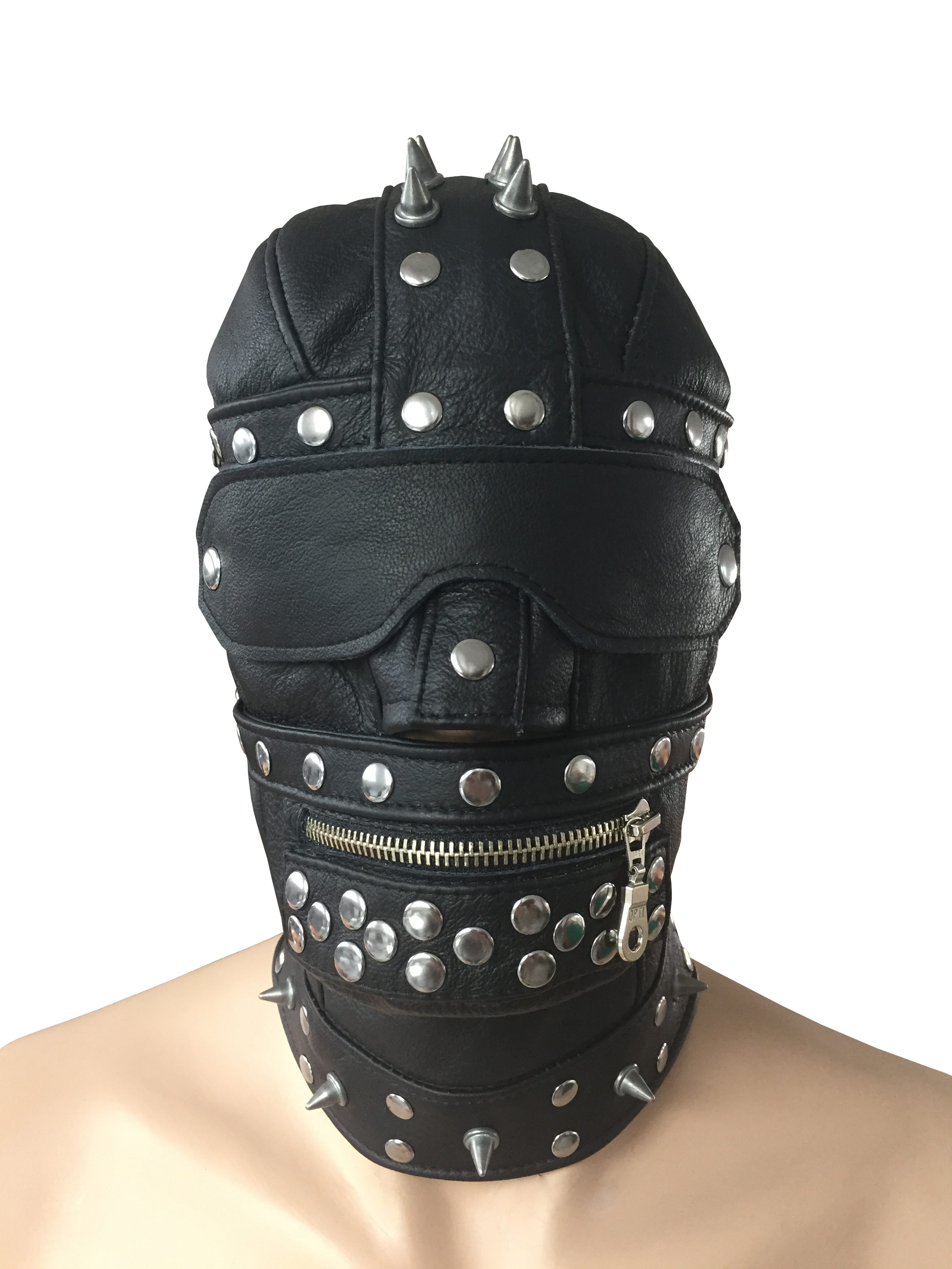 Die Maske hat zusätzlich eine abnehmbare und abschließbare Lederaugenbinde.