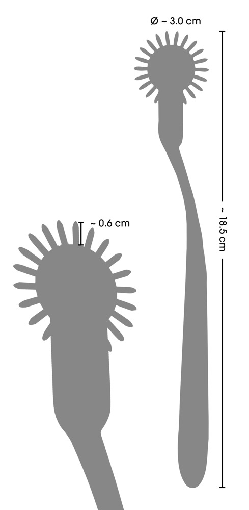 Gesamtlänge 18,5 cm, Rädchen-Ø 3 cm, Nadelspitzen 6 mm lang.